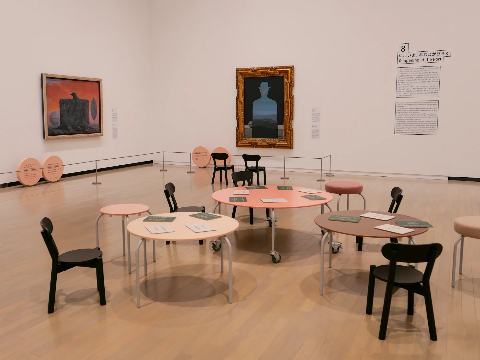 最終章となる「いよいよ、みなとがひらく」では、前半部分を子供のために選んだ作品で構成。「子どもの目で見るコーナー」として、ルネ・マグリットやマックス・エルンストらの作品を子供が見やすい高さで展示し、子供用の椅子や鑑賞の手がかりとなる問いかけパネルも用意している。