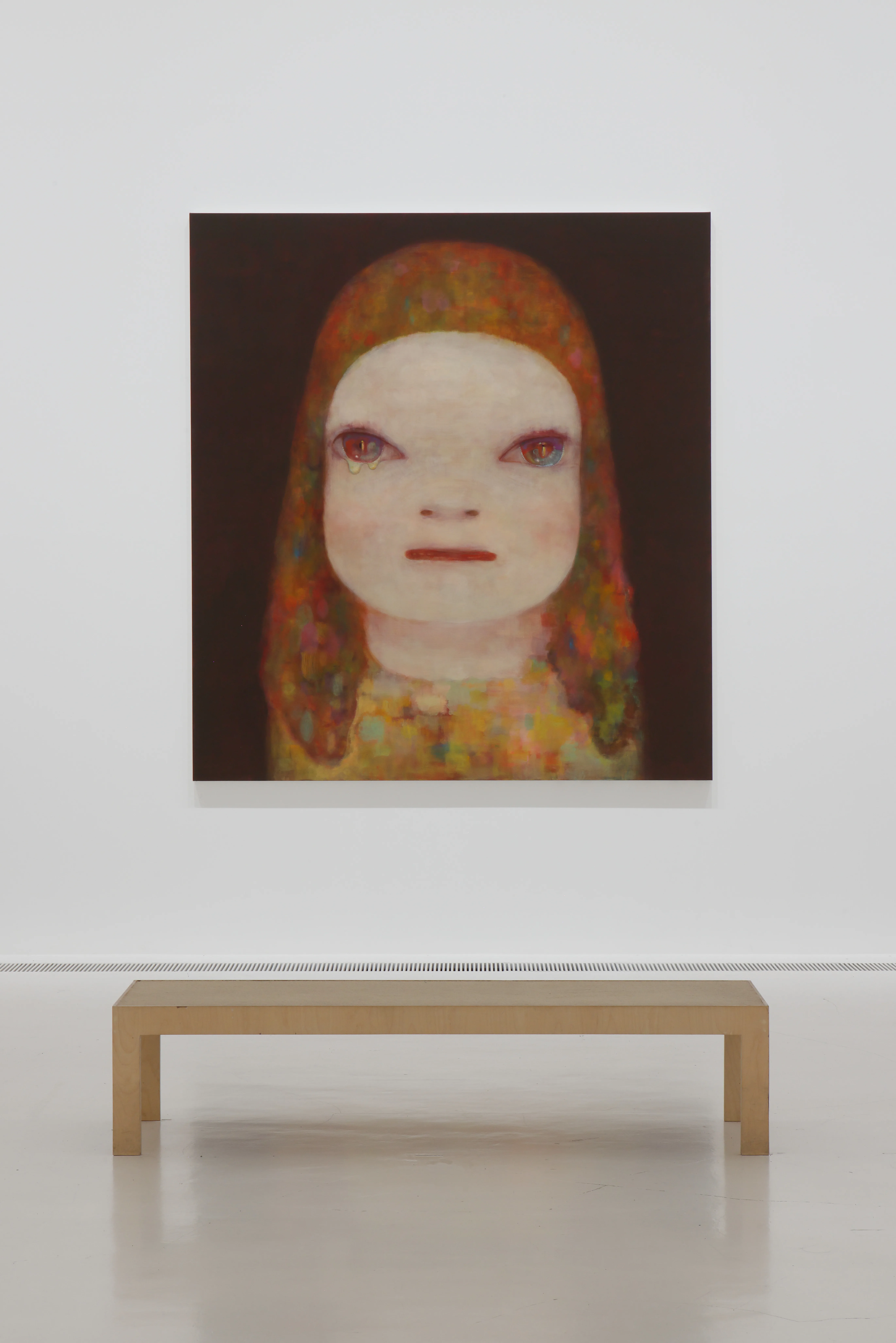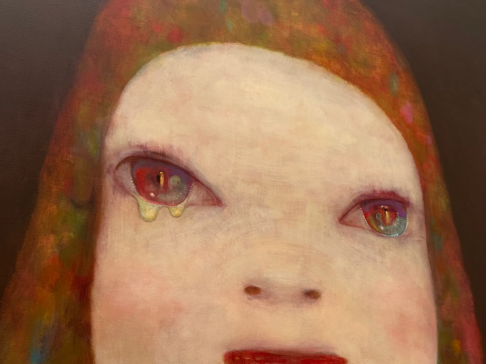 《Midnight Tears》も、展覧会のためというより、森美術館が持っている《Miss Moonlight》(2020)の目が閉じていない絵を描いておきたくて始めたもので、完成までに3ヶ月くらいかかっている。絵具が乾かないうちに塗ると下の色まで引きずられて消えちゃうから、木炭で目鼻の位置を描いたら、それが水で溶けて垂れて、泣いた女の人の黒い涙のように見えた。それで最後に涙を黄金色にして、そこにフォーカスが合うようにした。全部偶然なんだけど、それを必然と受け止めるような描き方をいつもしているんだよ。