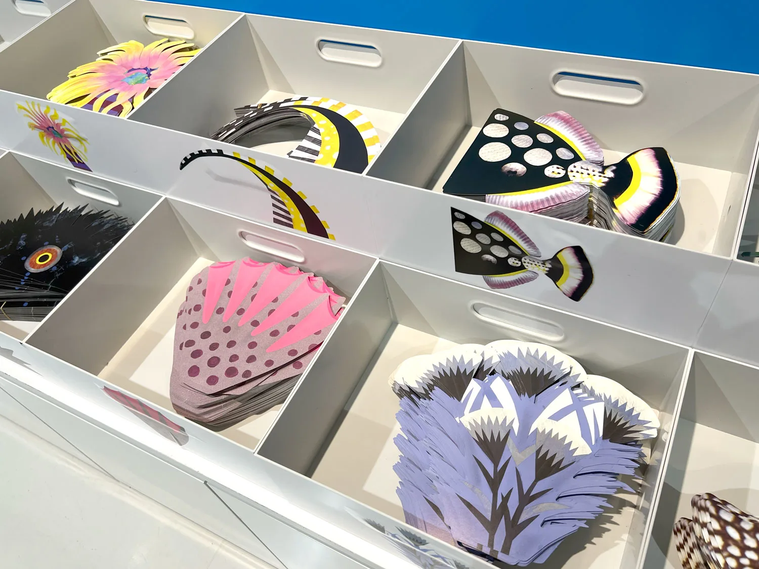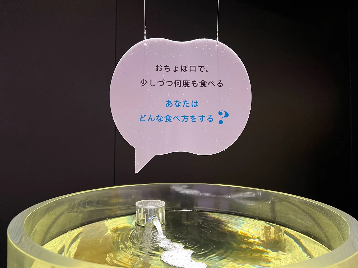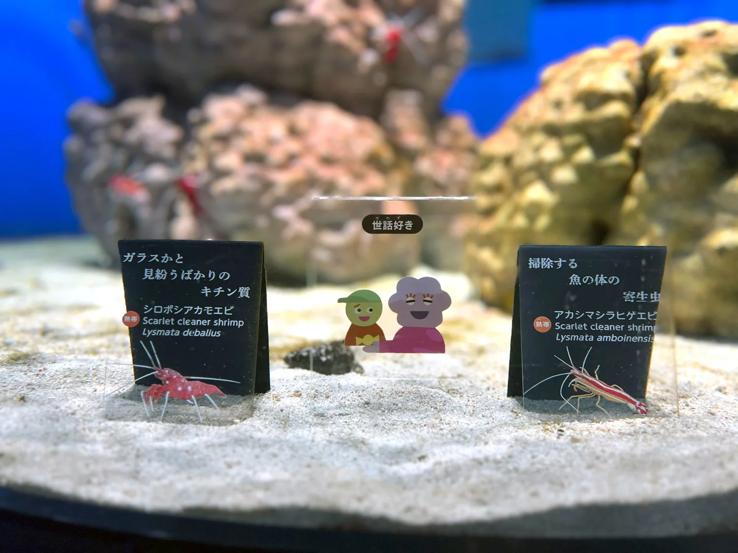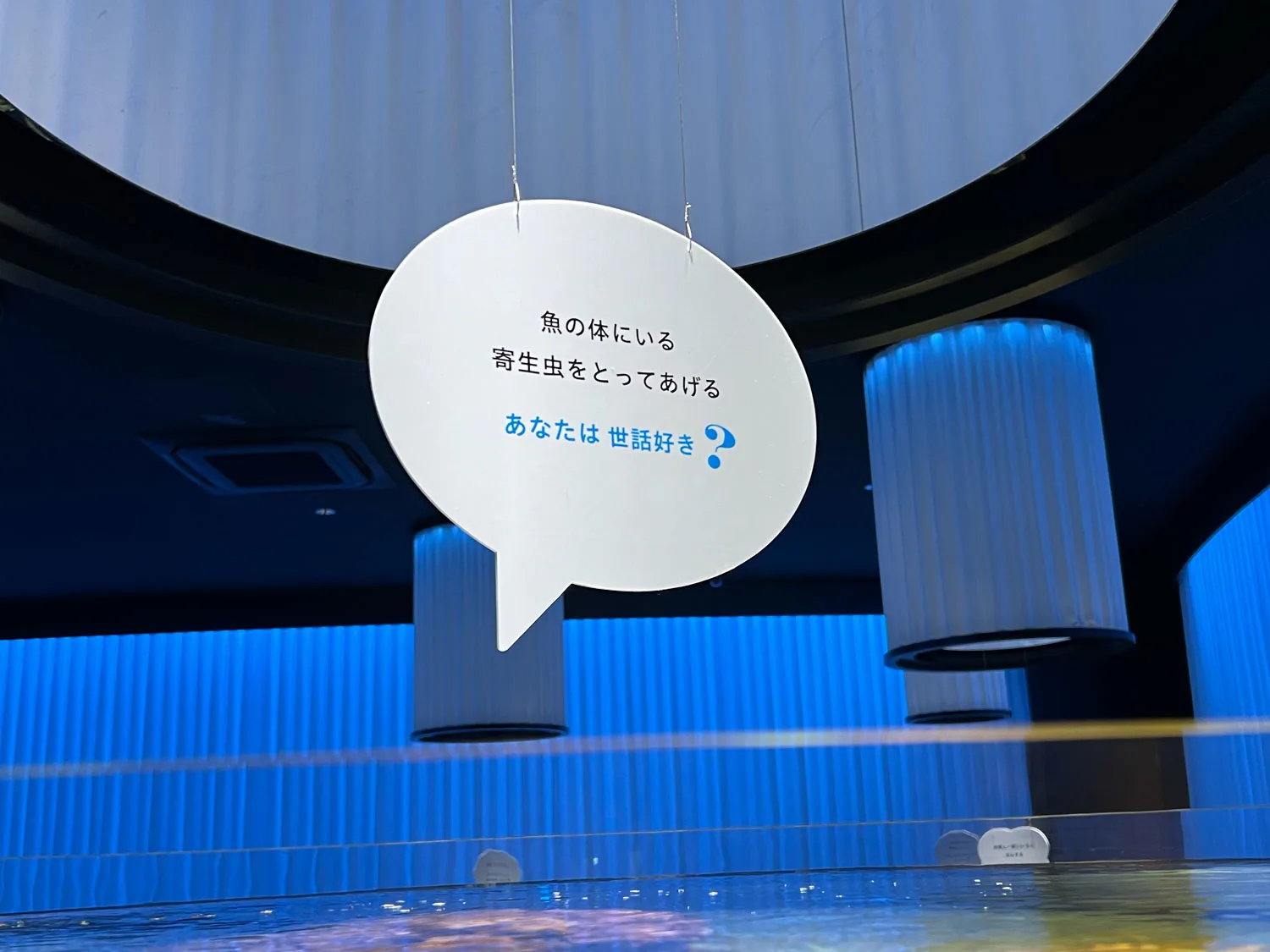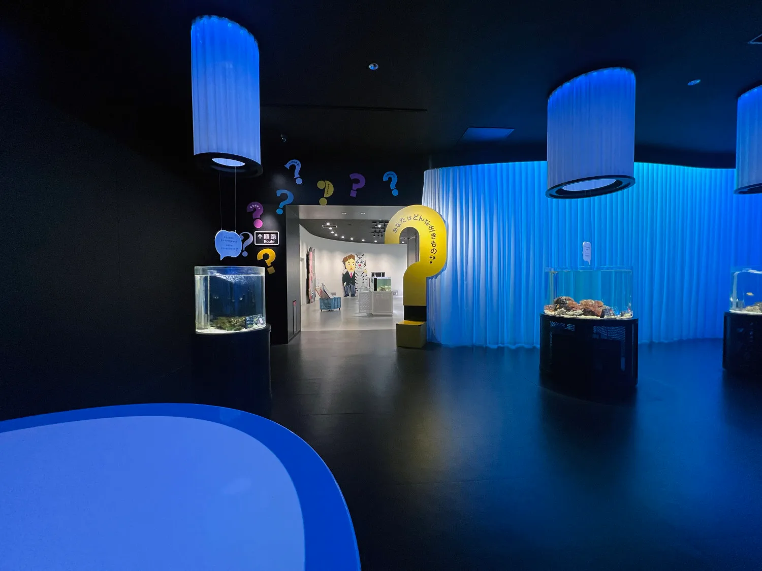 ニフレルで企画が催されているのは、展示エリア2つとワークショップブースだ。最初の展示エリア「いろにふれる」では、13台の水槽の中から生きものが自己紹介を交えて、来観者に吹き出しでメッセージを投げかける。「あなたはどんな食べ方をする?」などの問いかけは、自分自身を振り返るきっかけを優しく促してくれる。