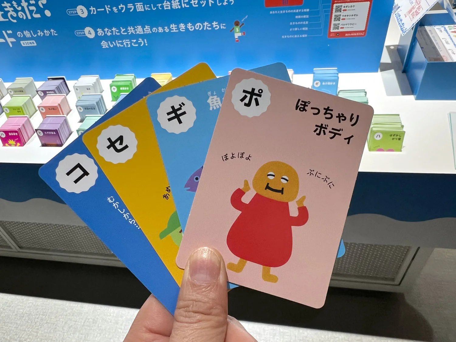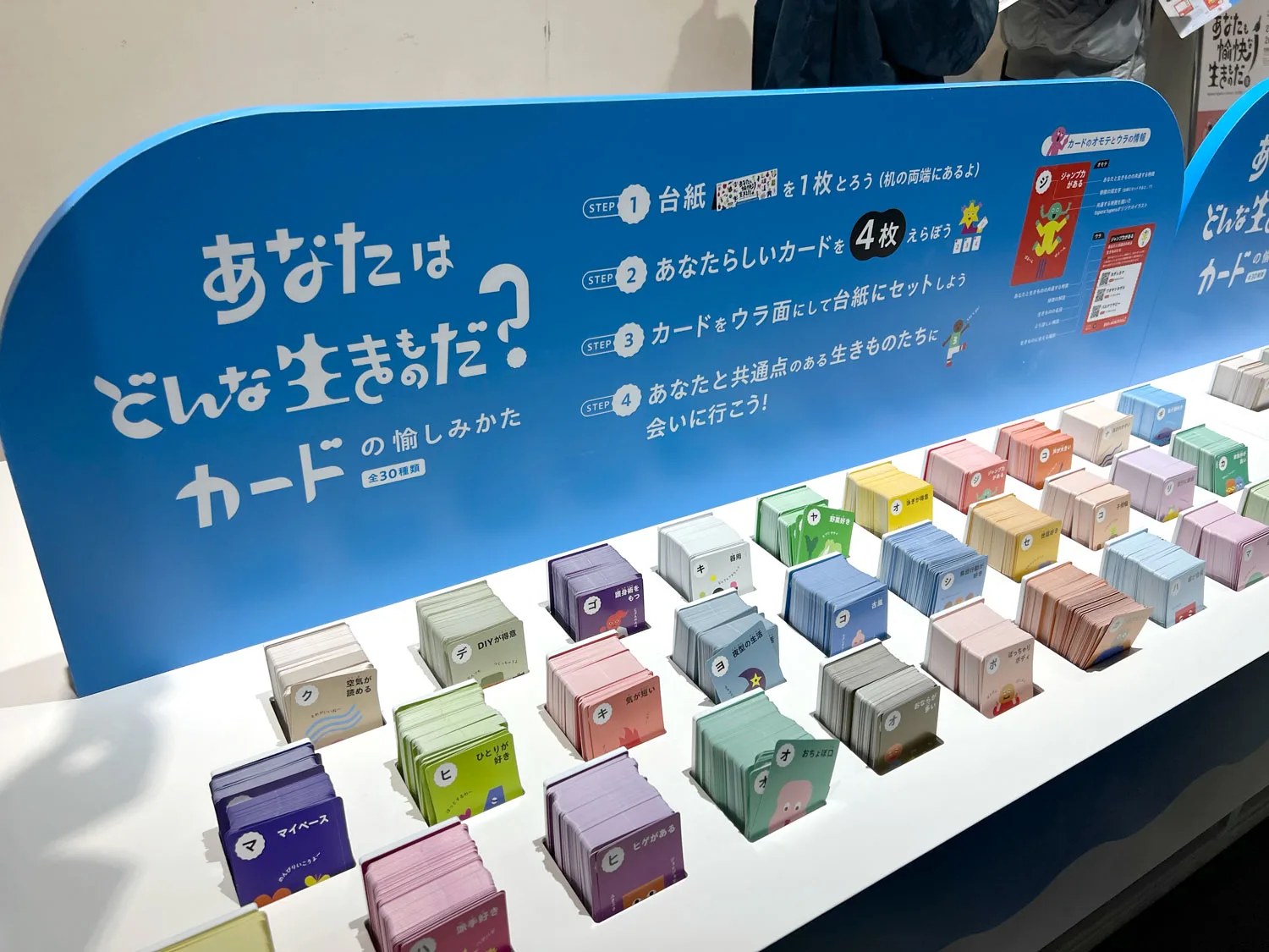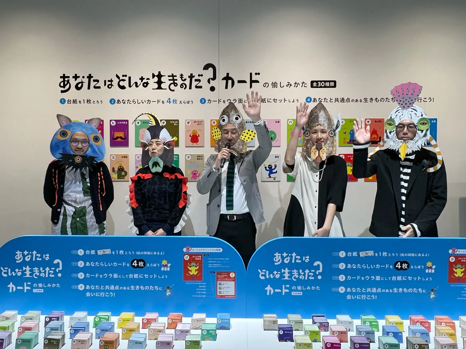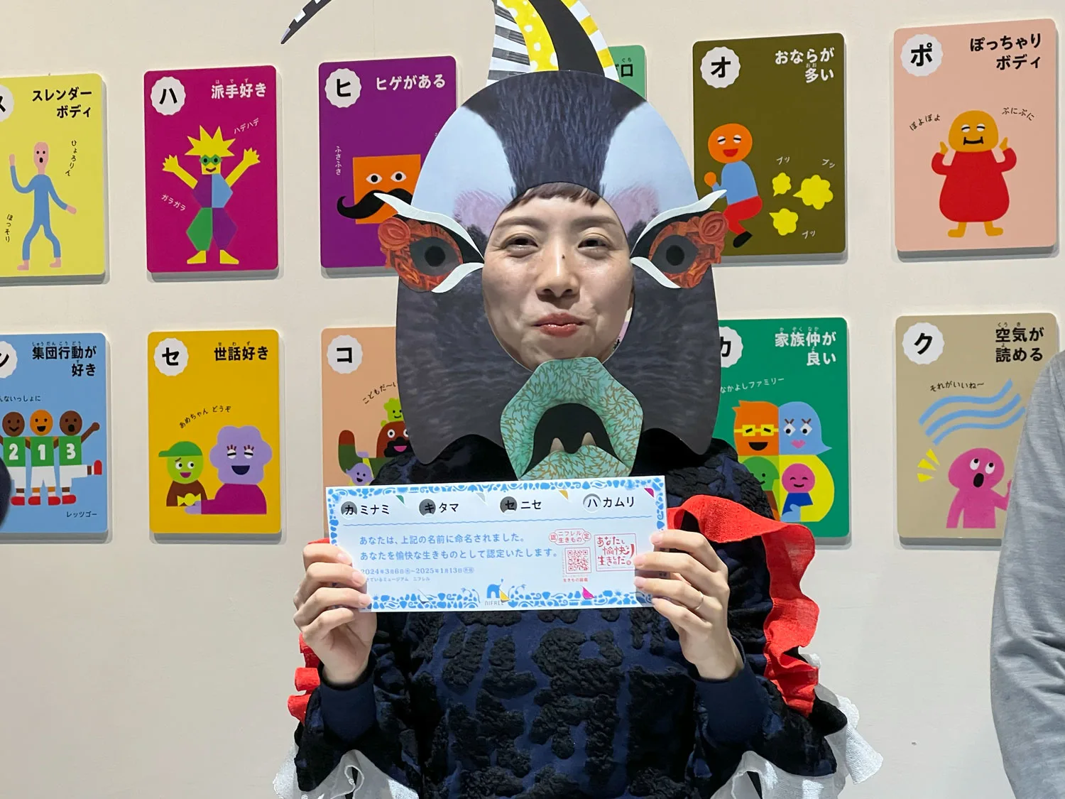 カルタのようなカードには、「世話好き」「古風」「ジャンプ力がある」など、30種類のキーワードがイラストとともに描かれている。その中から自分らしいと思うカードを4枚セレクト。裏面には、自分と共通点のある生きものとニフレルでの居場所も書かれており、どんな生きものがいるのか会いにいける。さらに、台紙にカードをセットして、裏面を見るとなにやら不思議な言葉が……、これはあなたの新しい生態名なのだ。「生きものって人間が勝手に色んな名前をつけていますよね。この理不尽さを体験する仕掛けです(笑)」とtupera tuperaの亀山達矢。