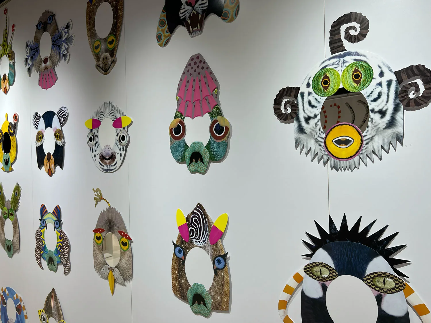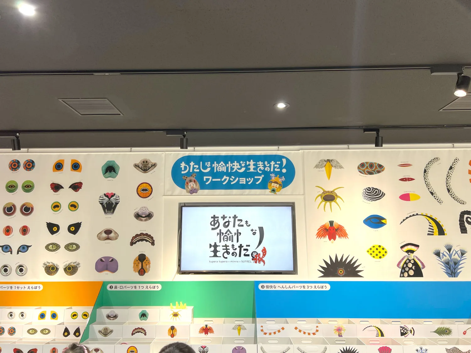 会期を通して開催されるのが、「わたしは愉快な生きものだ!ワークショップ」だ。これはtupera tuperaが描き下ろした多彩な生きものパーツを組み合わせてお面をつくるワークショップで、完成後はお面を着用して、館内を巡って写真撮影を楽しめるものだ。8種類のベースに、目・鼻と口・変身パーツを自由に選び、自由に生きものを作ることができる。(参加有料:1人1000円、ペアで1800円)