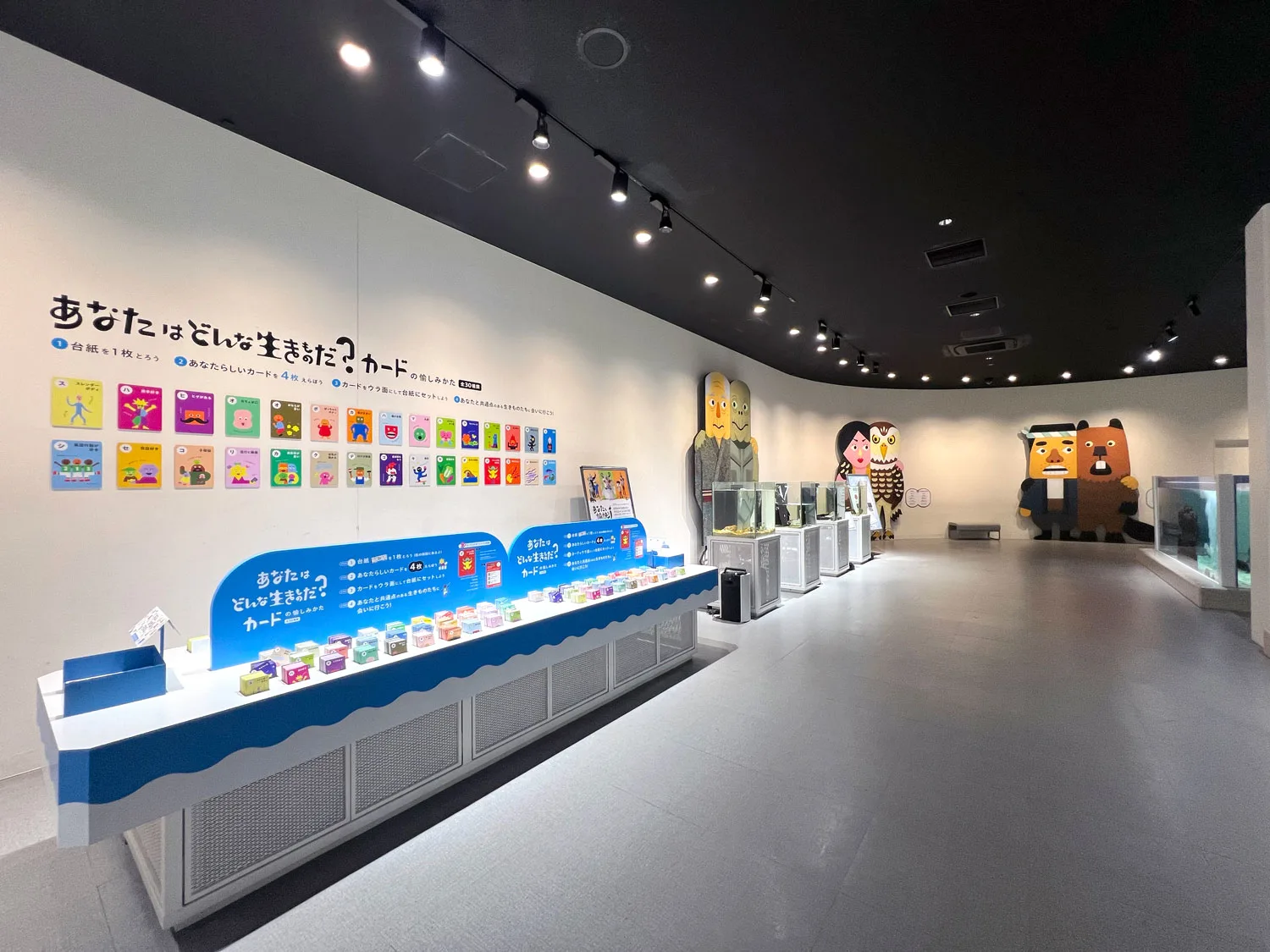 続いて、メインエリア「わざにふれる」では、生きものと人の共通点を表現したtupera tuperaによる新作「にてる?にてる!」が描かれた大型作品10点が展示。そして、生きものと人の共通点がわかる、30種類の「あなたはどんな生きものだ?カード」が並ぶ。(参加無料)